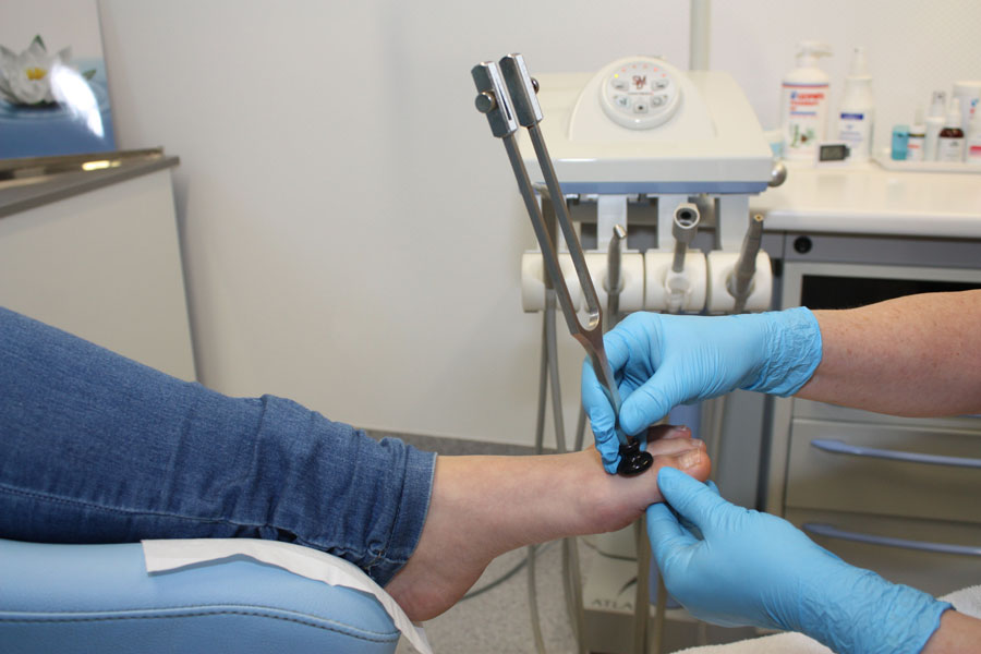 Gefährdete Stellen und Fußläsionen werden so erkannt. Um eine Neuropathie festzustellen, werden einzelne Sinnesqualitäten mit unterschiedlichen Methoden überprüft.